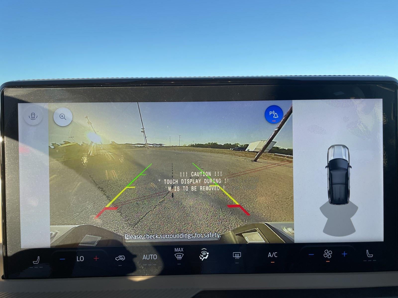 - The vehicle is equipped with a camera that displays an image of the area behind the vehicle on an interior display.