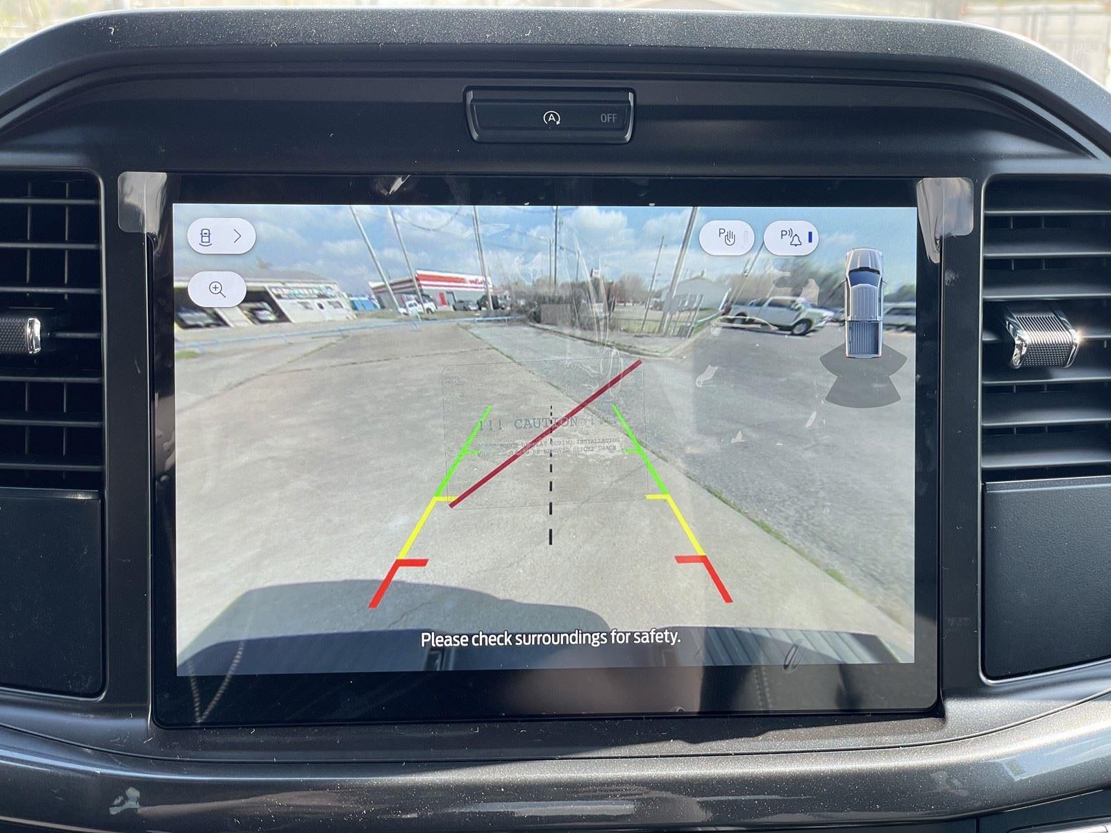 - The vehicle is equipped with a camera that displays an image of the area behind the vehicle on an interior display.