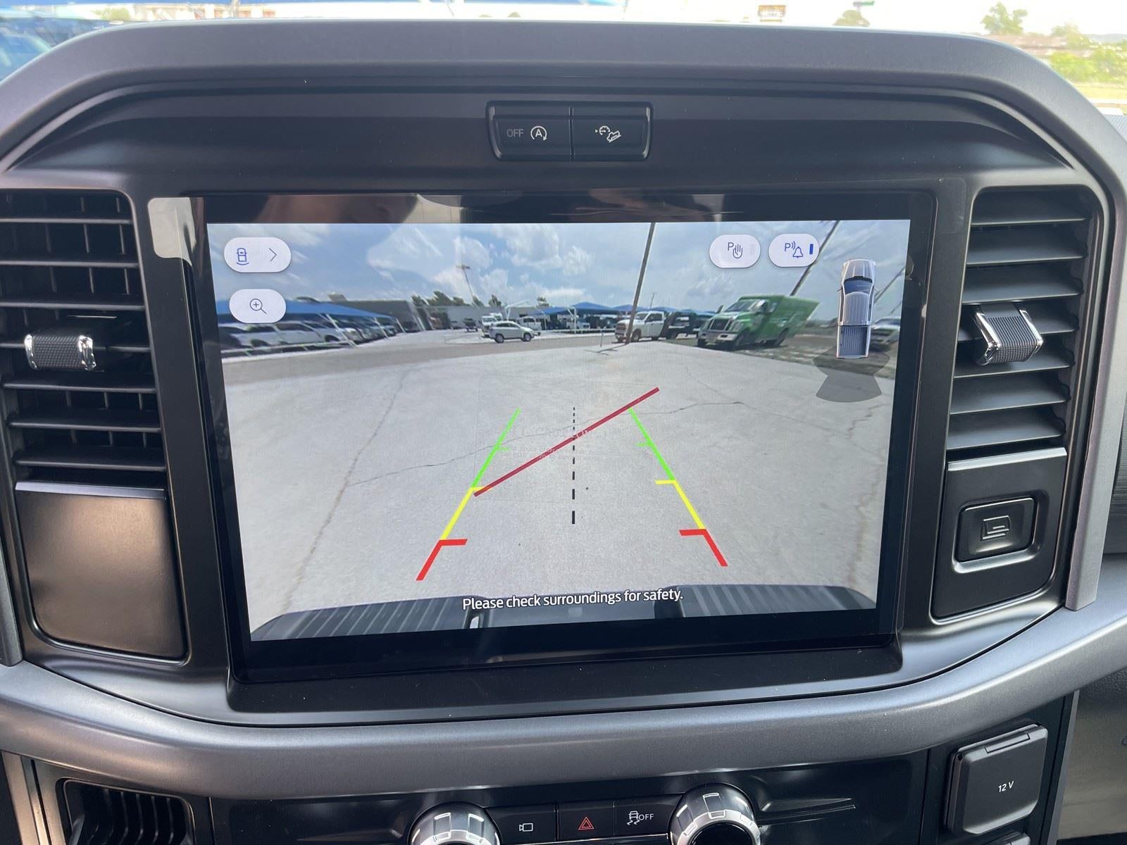 - The vehicle is equipped with a camera that displays an image of the area behind the vehicle on an interior display.