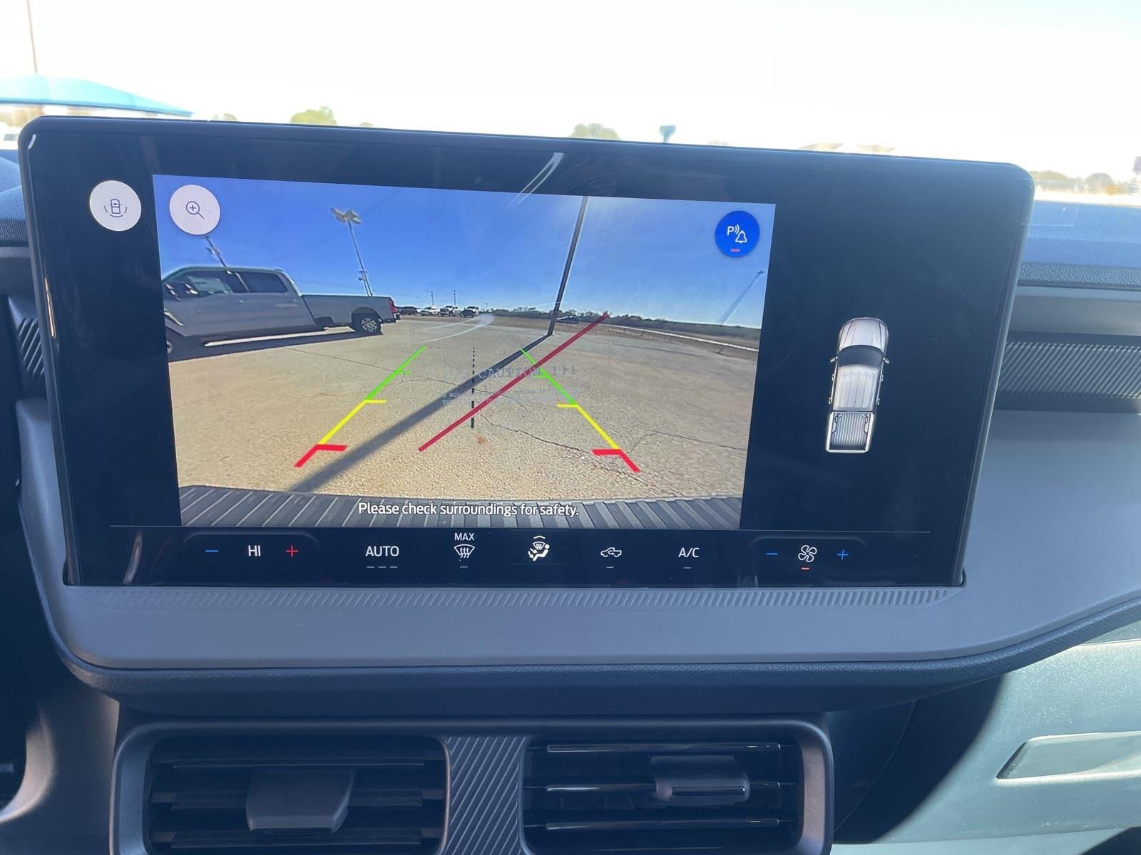 - The vehicle is equipped with a camera that displays an image of the area behind the vehicle on an interior display.