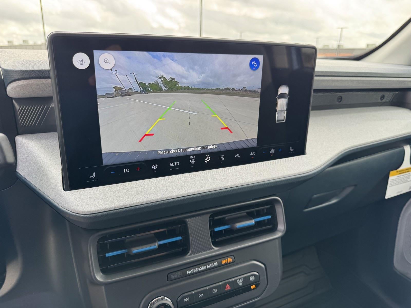 - The vehicle is equipped with a camera that displays an image of the area behind the vehicle on an interior display.