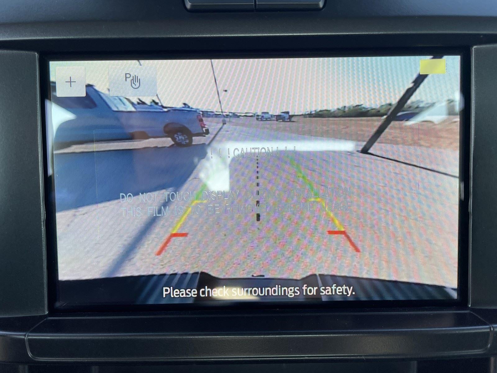- The vehicle is equipped with a camera that displays an image of the area behind the vehicle on an interior display.